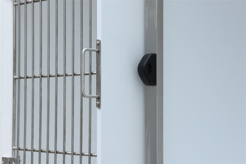 Dotato di serie di porte con chiusura automatica a doppio punto, lo spazio minimo tra le barre verticali e i fori di chiusura garantisce un funzionamento quasi silenzioso anche quando le zampe degli animali domestici toccano leggermente il pannello della porta. Un telaio da 8 mm di diametro, barre verticali da 6 mm e traverse da 8 mm formano collettivamente una struttura a gabbia sicura e robusta.